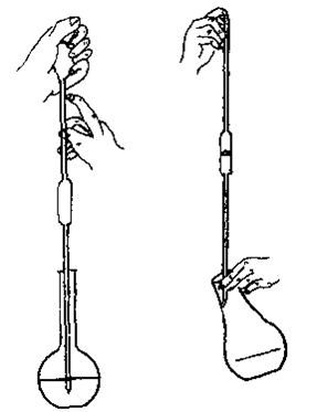 再用水連續振蕩數次,必要時用蒸餾水淋洗三次。洗凈狀態下,水均勻分布不掛水珠(如左圖所示);未洗凈狀態下,器壁掛著水珠(如右圖所示)。