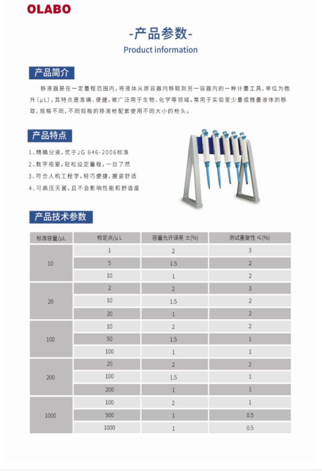 國產OLABO,B系列單道可調式移液器2-20μl量程:2-20μl,精確分液,數字視窗,符合人體工學,握姿舒適