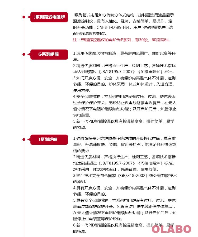 3、安全保障措施:本系列電阻爐設有過壓、過流、爐體表面過熱保護保護開關。另設防止供電線路停電恢復后,在無人值守情況下電阻爐繼續(xù)加熱功能;及開啟爐門后,爐膛停止供電裝置。